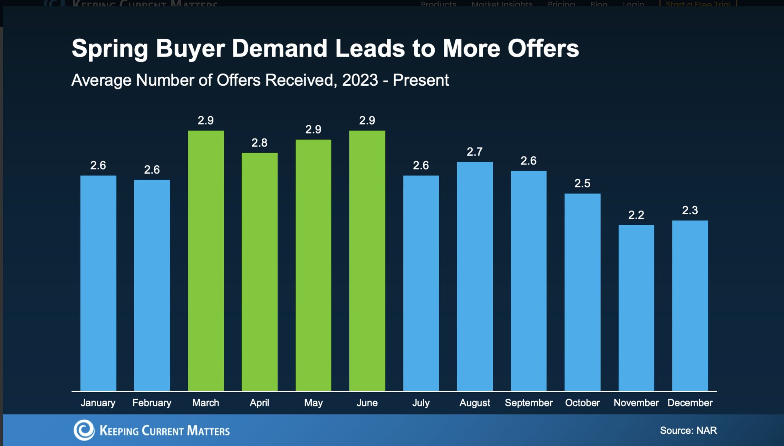More buyers naturally means more competition—and that often leads to multiple offers. Looking at the last three years of data from the National Association of Realtors (NAR), Spring consistently delivers more offers per listing compared to fall and winter.